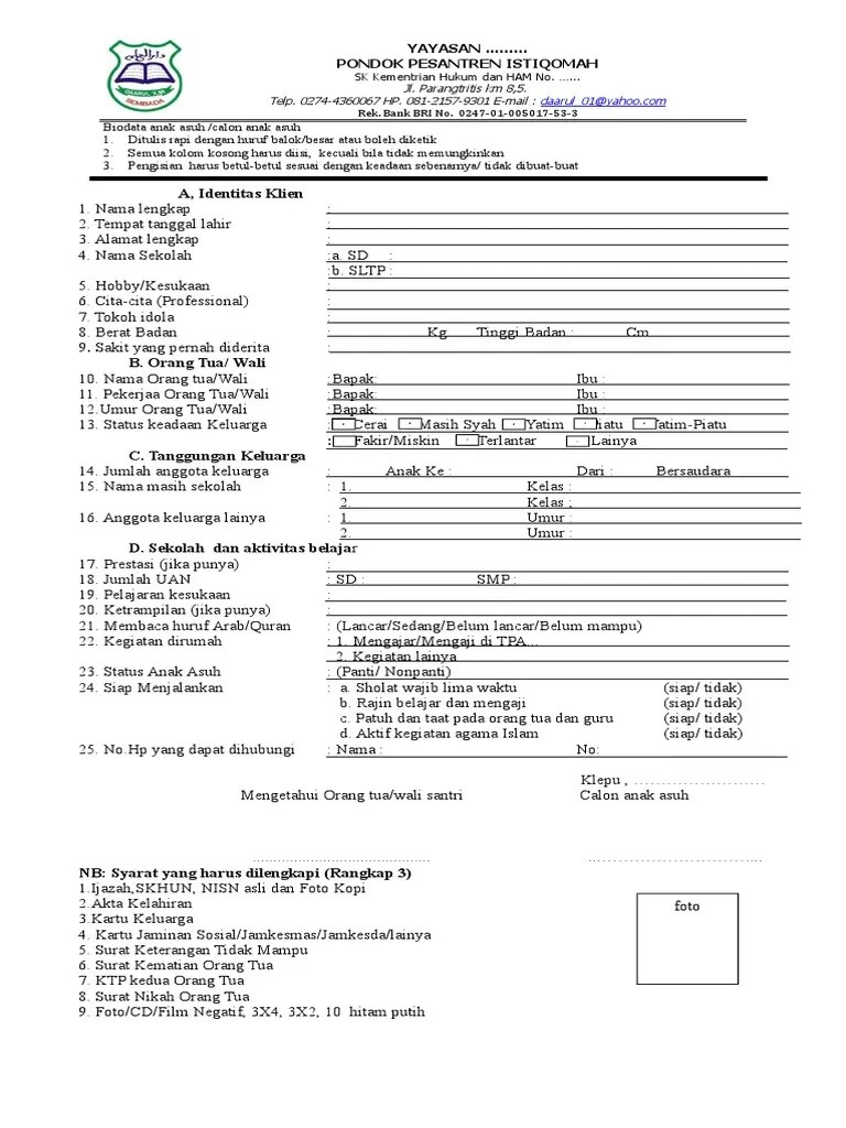 Download contoh blangko formulir pendaftaran santri rumah tahfidz.