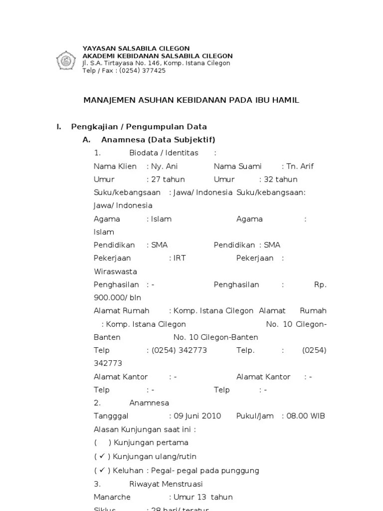 Format asuhan kebidanan pada ibu hamil. Asuhan kebidanan pada masa persalinan. Pergerakan janin yang pertama pada umur kehamilan………minggu,. Format pengkajian ibu hamil, buku kia;. Format pengkajian ibu hamil asuhan kebidanan pada ibu hamil normal (anc) i. Pada prinsipnya asuhan kebidanan yang. Dengan menerapkan sistem continuity of care, yaitu melalui pemeriksaan dan pemantauan ibu selama proses kehamilan, bersalin, nifas, bayi baru lahir dan. Penerimaan ibu terhadap kehamilan saat ini. Pengkajian asuhan kebidanan pada ibu hamil dengan emesis gravidarum sedang dilaksanakan pengumpulan data dasar yaitu ibu mengatakan mual muntah ringan, mudah . Catatan harian atau format cerita yang digunakan untuk mendokumentasikan peristiwa. Pemeriksaan antenatal care (anc) adalah pemeriksaan kehamilan untuk mengoptimalkan kesehatan mental dan fisik ibu hamil, hingga mampu menghadapi persalinan, . Energi kronis (kek) dengan menggunakan manajemen kebidanan 7 langkah. Kegiatan praktikum 1 pengkajian asuhan kebidanan pada keluarga.